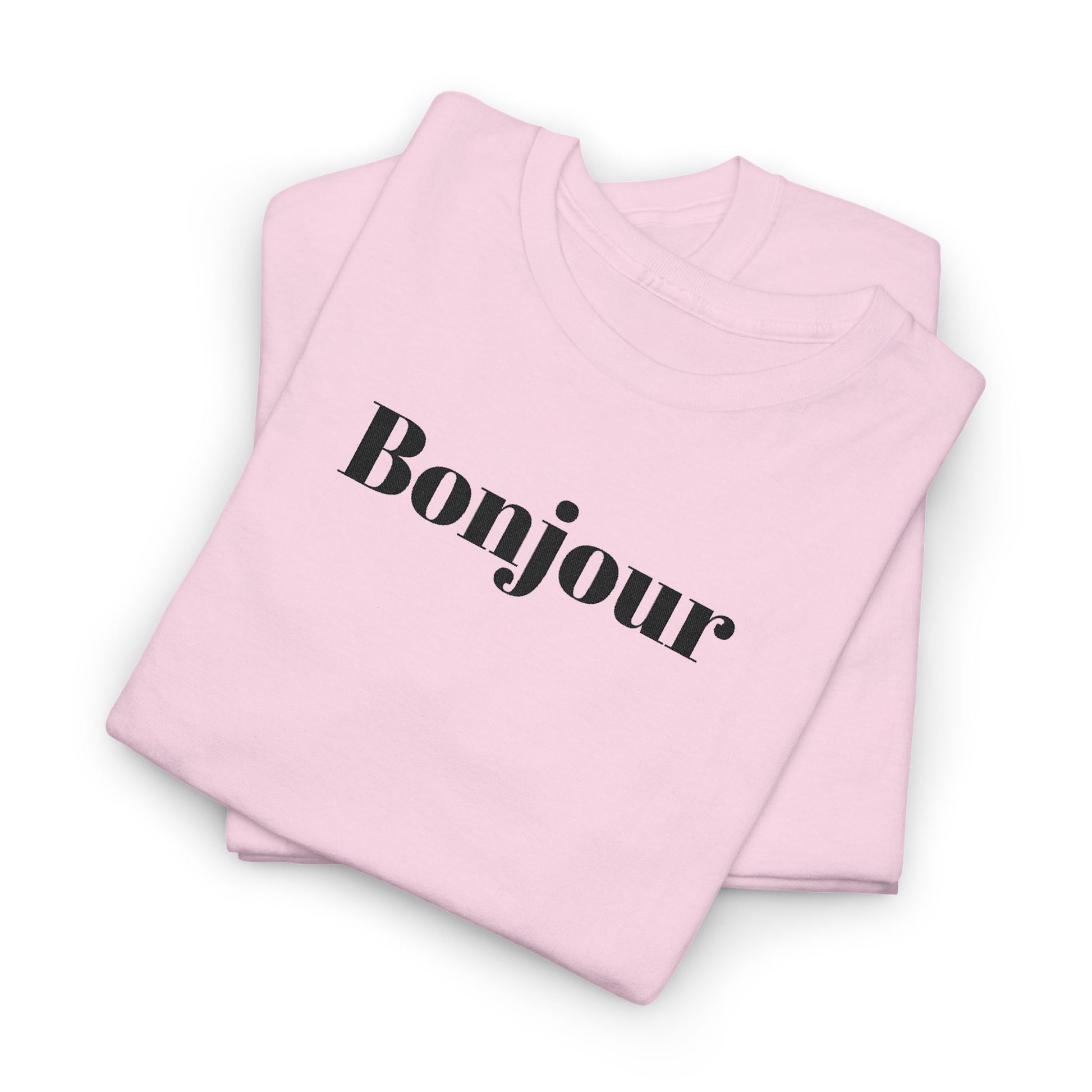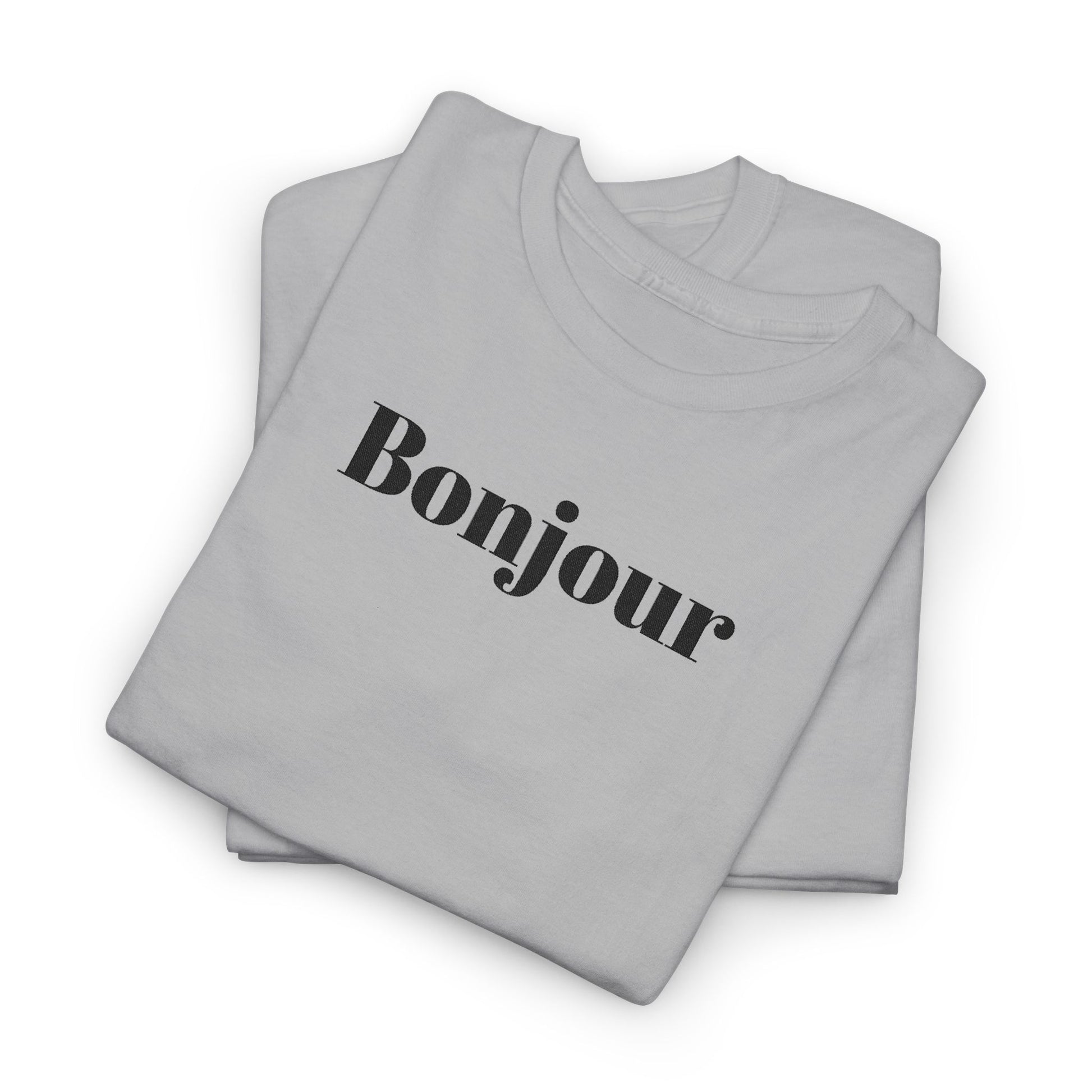 Black Thread Embroidered Cotton T-Shirt "Bonjour" which means "Hello" in French.